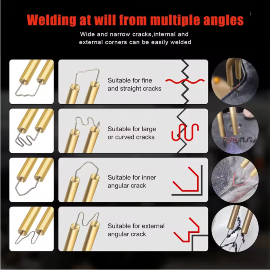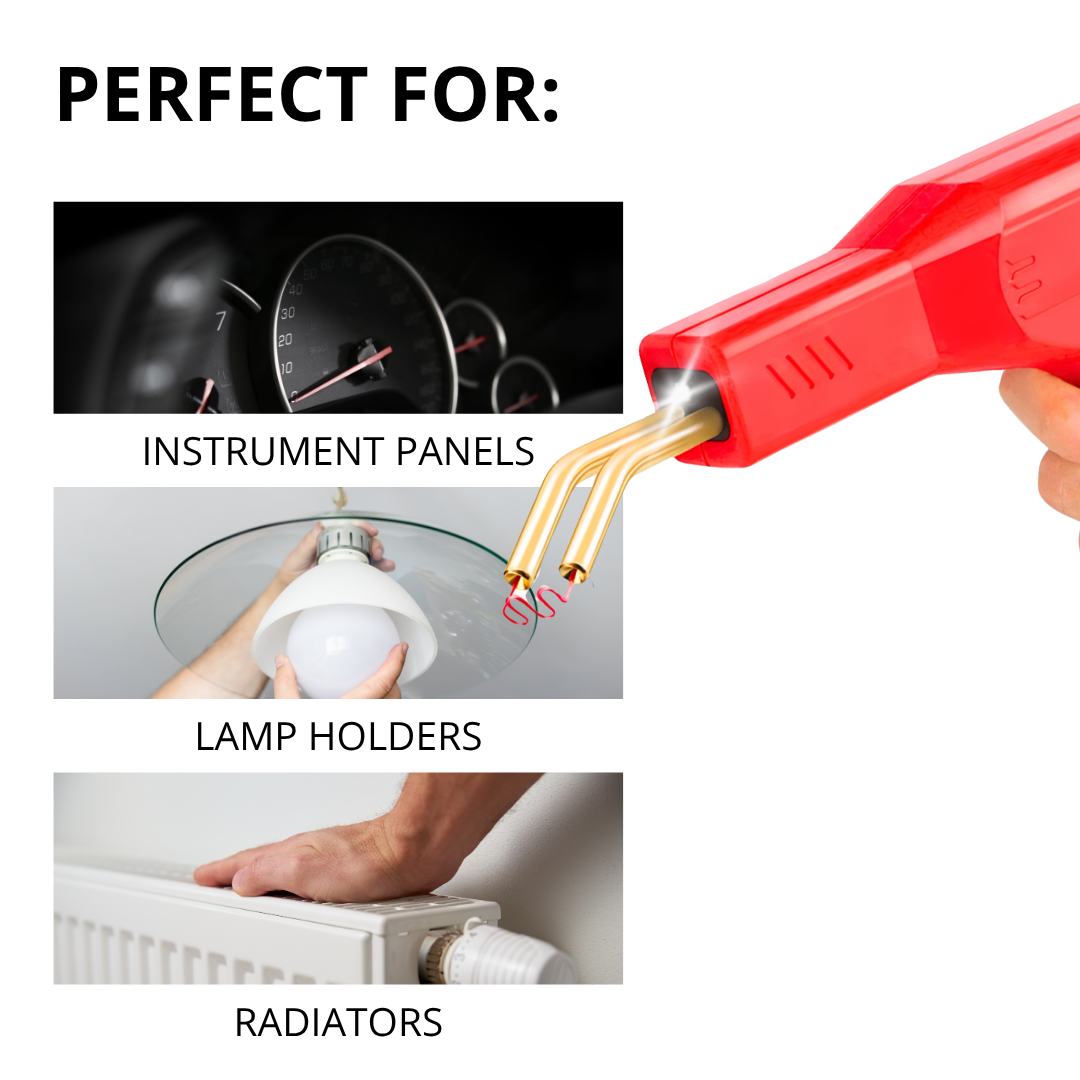 The machine heats metal staples that fuse into plastic, reinforcing damaged parts and preventing further cracking.