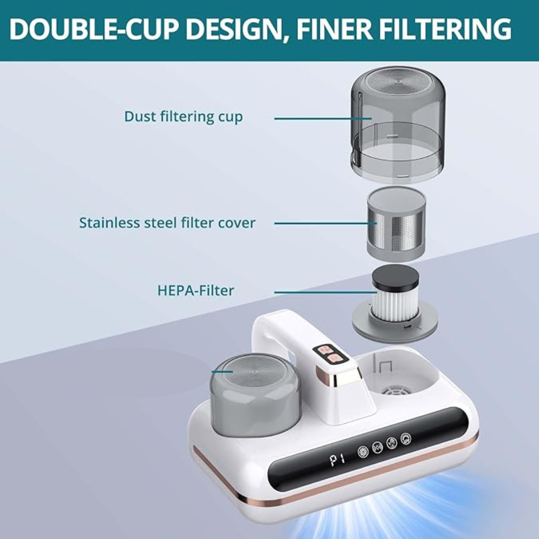 Dual Tap Hammer & Powerful Suction – The high-speed vacuum motor combined with dual tap hammer technology penetrates deep into fabrics, effectively removing mites and their allergens from beds, sofas, and upholstery.