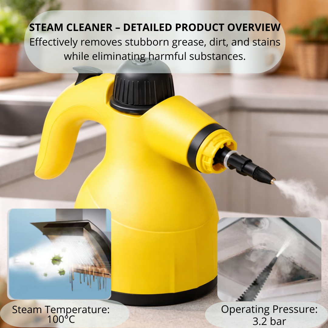 The Handheld Steam Cleaner is a powerful, compact, and eco-friendly cleaning solution for every home. With 1000W of power and a wide range of nozzles, it removes dirt, grease, and bacteria using only high-temperature steam—without harsh chemicals. Designed for versatility and efficiency, it is ideal for deep cleaning kitchens, bathrooms, windows, upholstery, and even car interiors.
