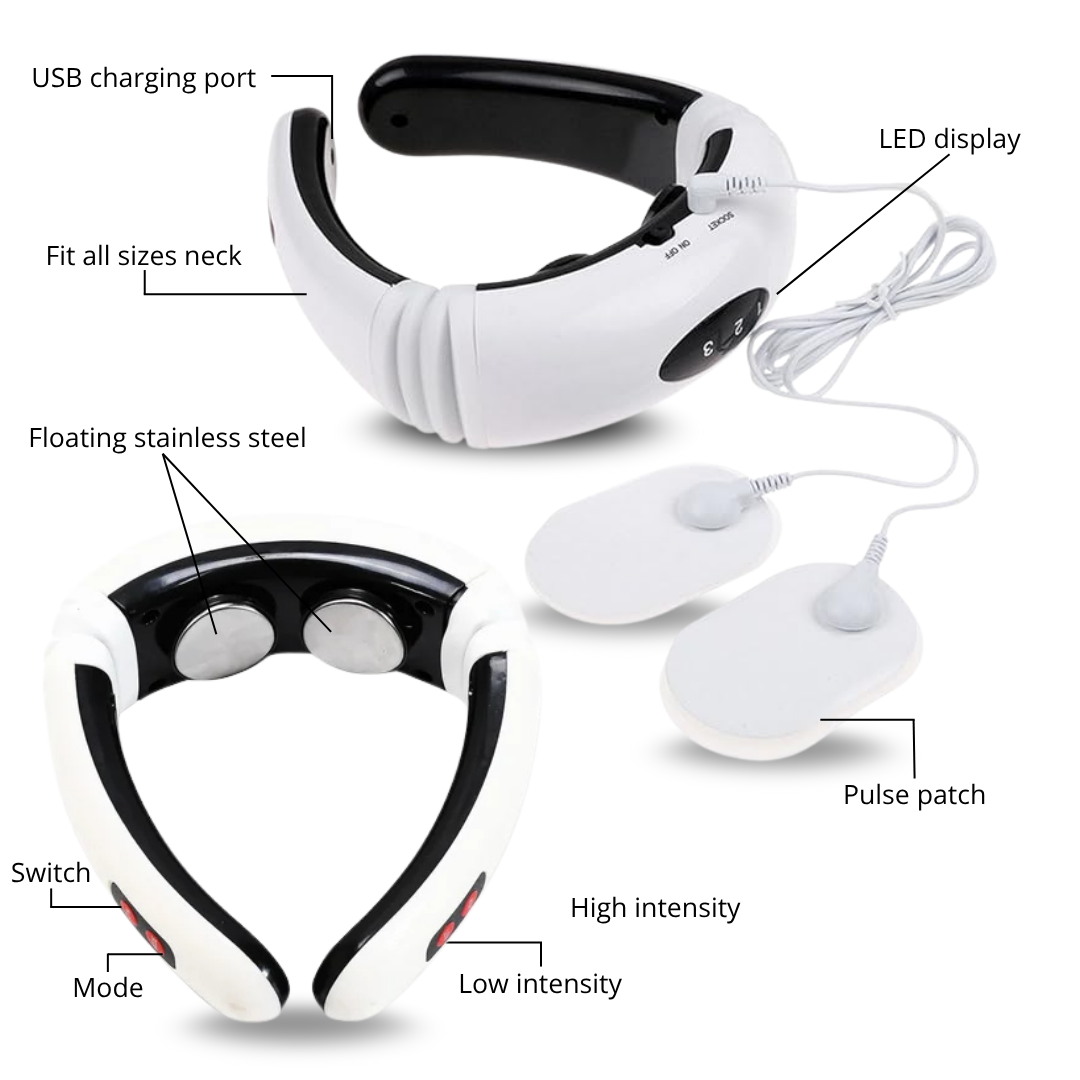 The device uses low-frequency electrical pulses to penetrate deep into neck muscles, easing tension, reducing stiffness, and boosting blood circulation for long-lasting relief.