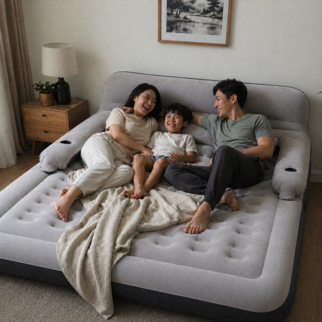 Measuring 202 cm × 152 cm × 70 cm, this large airbed comfortably accommodates 2 adults and 1 child. Its generous size makes it perfect for families or couples who need extra space.