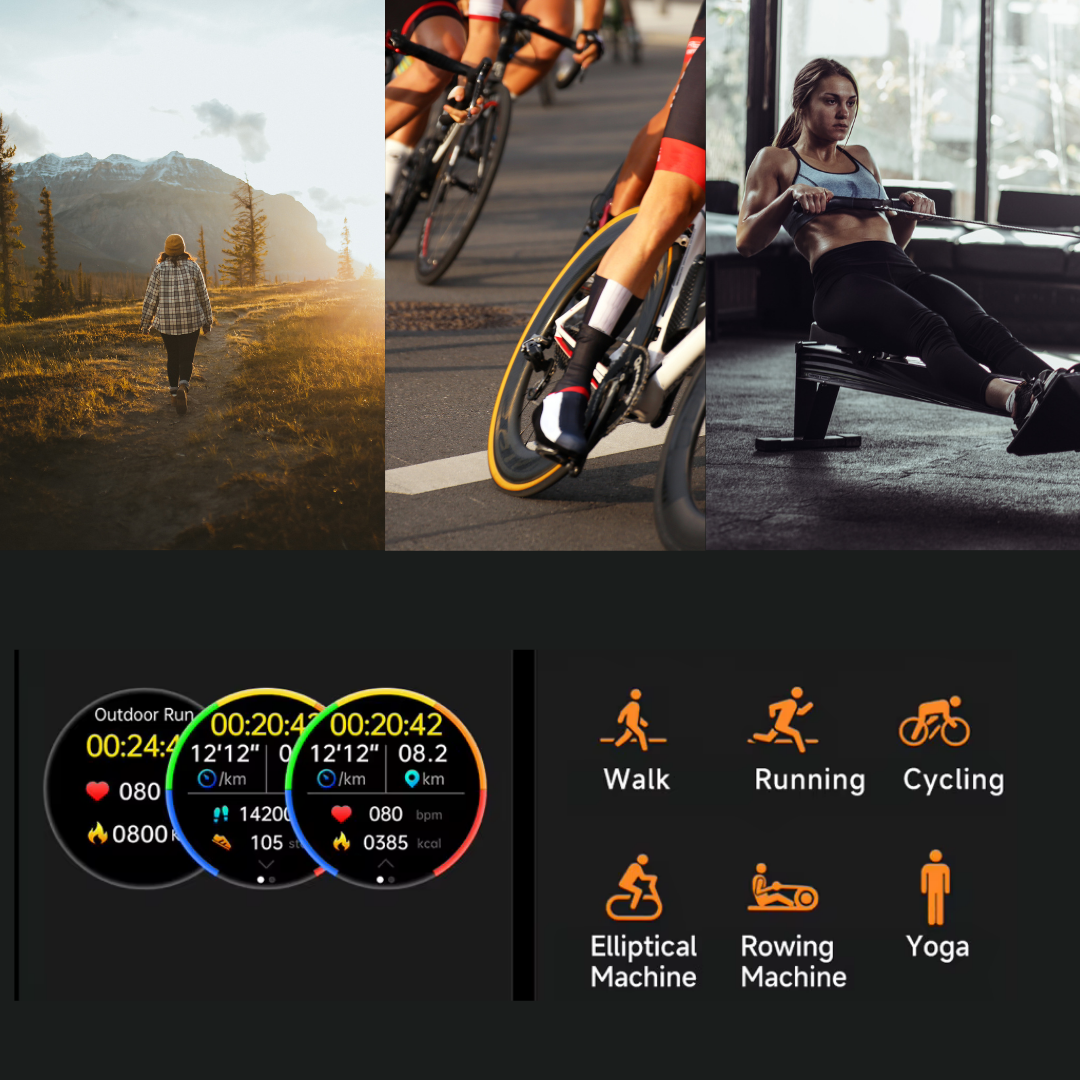 - Step counter, calorie tracking, and detailed multi-sport modes including: unning, walking, indoor walking, treadmill, hiking, trail running, marathon, road cycling, spinning, mountain biking, BMX, climbing, outdoor walking, mountaineering, fishing, hunting, skateboarding, roller skating, parkour, motocross, indoor sports, fitness training, strength workouts, yoga, pilates, dance, ball games, ice sports, chess sports, and many more.