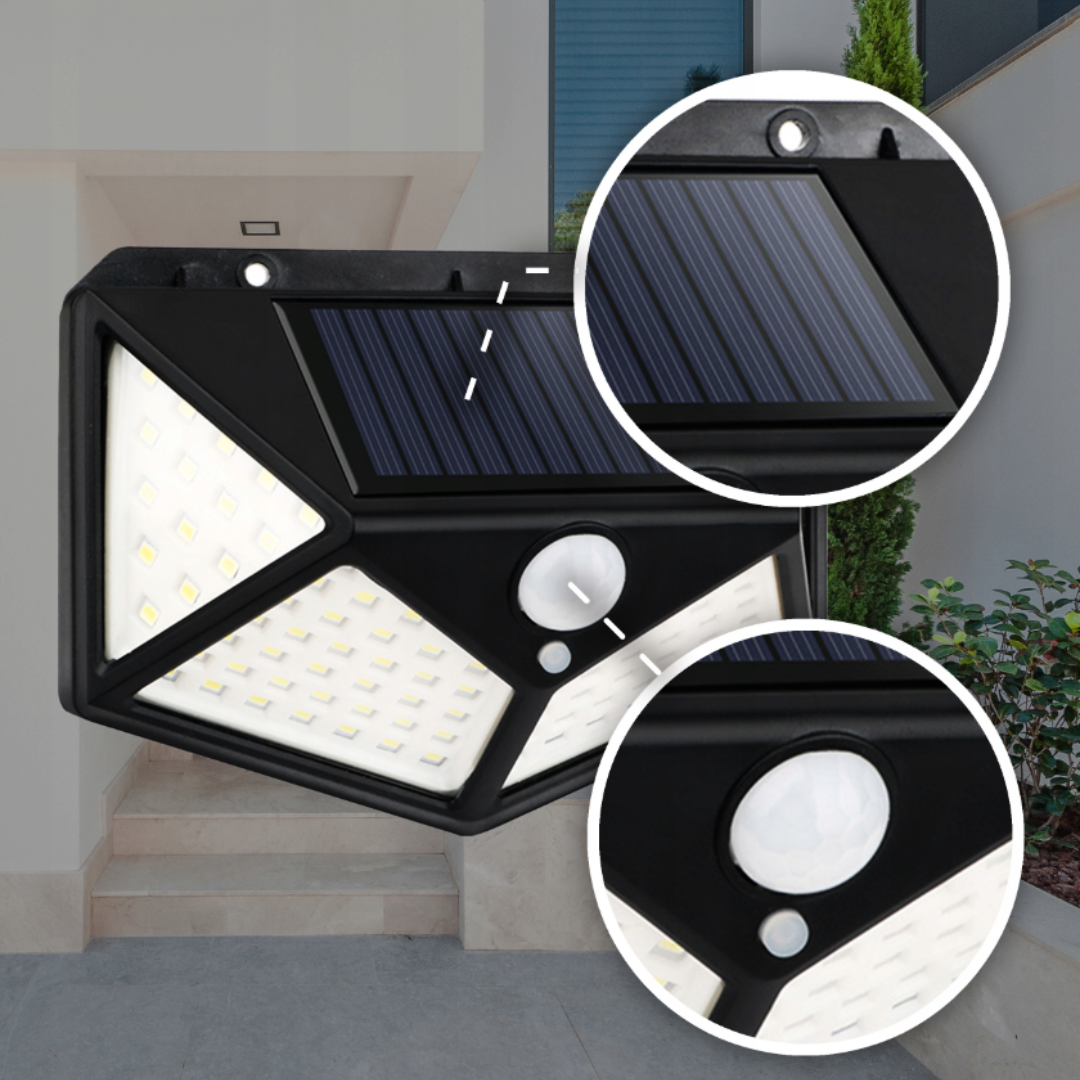 Brighten up your outdoor spaces with the modern solar LED wall lamp, featuring 100 powerful LEDs and motion sensor technology for efficient, eco-friendly lighting all year round. WIth a built-in solar panel, this lamp provides free illumination without the need for electrical installation!